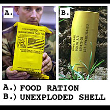 Something else to note while we're wrapping up Operation Anaconda... We've recently realized the packets of food rations we've been dropping are strikingly similar in appearance to that of undetonated cluster bomb shells. Stay nourished, but just make sure the next food packet you pick up isn't three seconds away from blowing your face off. Unexploded cluster bomb shells are extremely volatile and can detonate with even the slightest disturbance.