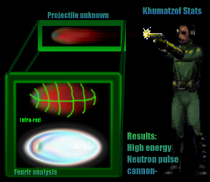 Deep.route>mine shaft terminal Signal cleared-by way of relay 37 relay answers on band depth y100.3 Signal from Fenrir- decoding>>>> I assume you know how to use it. It's just a point and shoot weapon, similar to your pistols. There is, however, a major drawback I forgot to mention. The Khumatzof fires a focused neutron pulse at its target. This pulse will disrupt the life cycle of any living thing and cause it to collapse. But the high energy neutron pulse can have deadly side affects to you, the shooter. One word. Potato? no..... Shields.