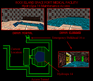 Maintenance Duct 43-j HydroSpa 14 Cleaning Area AUTHORIZED ACCESS ONLY Cleaning personnel: When clogging of HydroSpa 14's drain occurs (usually due to organic detritus), emergency bulkhead 16-a will seal, in order to keep the entire facility from flooding. This access tunnel will be your only access to the drain. SCUBA gear can be found in maintenance closet 433.