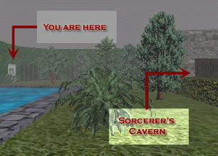 You are currently in the castle's southern courtyard. The gate is controlled from the inside. If the gate is locked, you can find another passageway in from the Sorcerer's Cavern.