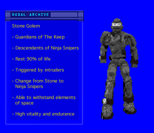I will communicate with you for only a few brief moments from this point forth. You must move on Morgana now. I have brought you to the secret space colony of the Stone Golem. It is here where Morgana keeps a backup of a high security portal access card for the Reina Siniestra. You must retrieve this card before teleporting to her flagship. Be wary of the Stone Golem. In rest, the golem exists as a harmless stone figure. Once awakened, however, the golem transforms into a powerful sniper. In order to retrieve Morgana's access card, you have no choice but to awaken the golem as you invade their Keep. Cunning will be your best weapon against these creatures.