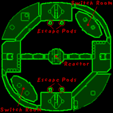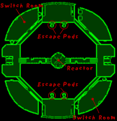 This is the third and top deck of the station, your final destination. Your goal here is to gain access to the "top" of the reactor core. When there, you should be able to destroy the breaker circuitry, resulting in a forced shutdown of the core and activation of emergency power. Once the station is low on power, I can destroy it easily. Getting there will probably require making your way to the switch rooms and opening several doors. Additionally, you'll need to jump from the top of the stairs to a space above the elevators to reach switches which open the passages to the reactor. After you destroy the circuitry, the escape pods will become active and you should get in one as quickly as possible.