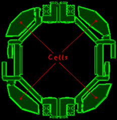 Here is the second deck's layout, in clearer detail since the radiation levels are lower here. The only important things on this floor are the four cells holding the humans. Unfortunately, the oxygen in their rooms is sealed in so you can't catch a breather in there. Freeing the prisoners should be as easy as flipping a switch to deactivate the shielding surrounding them. Hopefully, getting to their cells won't be difficult either.