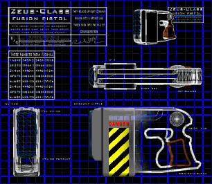 TRANSLATOR ENGAGED: EMERGENCY POST: ALL SECTORS REPORT IN: Prisoner #424566 has escaped from cell #29. All Gaurds and Enforcers stationed nearby should be careful. He is known to have a Fusion pistol (shown at left), and very little ammunition. Gaurds should excercise extreme caution when #V$#FVGV(unknown command) and should destroy him as quickly as possible. Do not attempt too take him alive he will kill you.