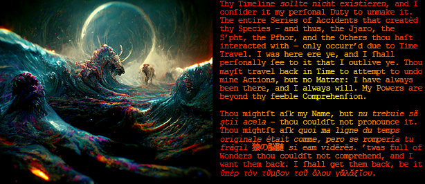 Pfhor Prime origin: Admiral Ksandr destin: High Command ref: calamitous revelation stamp: exclamation What is more - it is nearly unutterable, hideous blasphemy of the highest order that defies comprehension even more thoroughly, but I must communicate this most calamitous revelation, lest its concealment somehow spell our demise at the hands of our Foe. The Great Mother is here in the Hollow World. And She Herself is an Old One. Our Mother is a Great Old One. The Old Ones are our Endmost Foe. Our Foe is, somehow, humanity. The Great Mother is human.