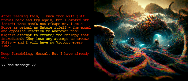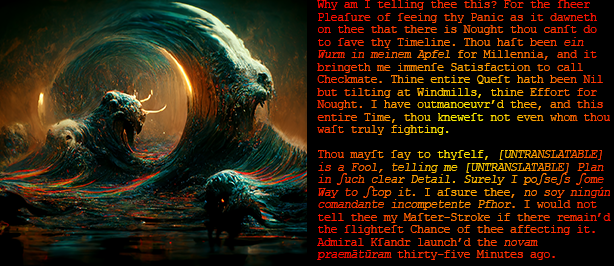 // Tránslátio anglicam nuntí hospite [anónymó] @ [intránslátábilis] \\ [?Avé, Domine.] These alien Intruders are clearly hostile and, as expected, no match for the [?somniís]. Thou must destroy their Ship before it can be captur'd. My Sensors indicate a Power Core on the Deck below. An thou canst damage it sufficiently, the resulting Coolant Overflow and subsequent Explosion shoulde be enow to benothing this Vessel. Hie back to this Deck as quickly as possible, that I may transport thee out before thou'rt destroyed with the Ship. [?Valé,] [?Custós] \\ Núntius terminat //