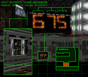 > So that is what that Human was doing teleporting in just now. I've no time to explain all the politics, but a small group of ex-employees appears dedicated to destroying this project. I thought we had crushed them. > Forget Gemini-B for the moment, take the chip and use it to repair the Countdown Manual Override circuit. This will open up access to the countdown chamber. > Take out the timer digit by digit using your inhuman ability with the grenade launcher. Be careful. The timer is protected by a non-sentient subsystem over which I nolonger have control: the traitors have done their work well. It will defend itself using the wall mounted plasma burst cannons, which are powering up as we speak, and a very large amount of molten ore.