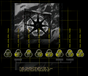 >Hermes was right when he called you persistant. You would appear to have toasted every one of those double crossing three eyed... {calm down. deep breath} >If you were being attentive during the last half hour or so, you would have been wondering about the identifiers used by each of the pfhor AIs. Or where you too busy perforating pfhor? >No matter. My records show a total of eight identifiers but only seven AIs in the fleet. The handy map one of them 'accidentaly' left around confirms this. >Hermes thinks he has found the eighth.