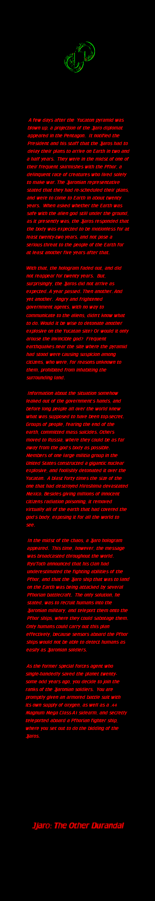 I need you to locate the central weapons control system of this ship and deactivate it. Currently the control system is initiating the ship's attacks on our Jjaro mother- and daughterships. After completing this objective, we will beam you back aboard our ship, assuming it is still in operation at that time.