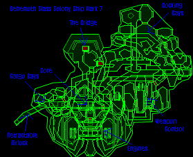 beings back to their original world, lest they ever wanted to return. The location of this second teleport still eludes me. If you ever want to go home, however, this is the only way. Right now, though, we should focus on getting this ship off the ground. To do this would be to free both of us. The map at right is a map of the ship. The ship is a Behemoth Class Cargo Ship (Mark 7). I got you this blueprint from the UESC database. If were going to fix the ship, the first thing you need to do is activate the emergency power. That should get all the system running again. The switch that turns the emergency power on is in the bridge, on the 3rd floor. First you can take the stairway in this room to get up to the second floor. Then you can go down the hallway, through the Core Containment room, into the Sensor Monitoring room where the lifts are. The lifts take you directly to the Bridge.
