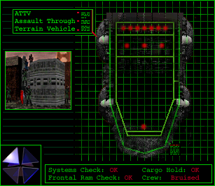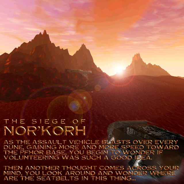 Due to the jolt you have gotten from the impact, your memory might be a little damaged. Let me brief you of your situation and mission... You are currently on the planet Na'Toth, in me, your trusty Assualt-Through-Terrain-Vehicle. The Commander has given me your mission just in case a memory loss did occur. The mission is to infiltrate and seize the military installation known as Nor'Korh. This facility is one of the largest most important compounds to the Pfhor. It is home of the Pfhor Leader Karth pa'Kohr. You have just rammed through the outer wall of the compound, thanks to me... and this is why you might seem a little weak and out of place. The reason for a direct assault through a wall, instead of just beaming in, is because of the Electric Force Barrier (EFB) that prevents any teleportation. And yes this means that no more supplies will be given to you. There are weapons and ammo in the back compartment for your enjoyment. You will have to find the locked supplies of weapons that the pfhor have stolen from our armies. Some BOBs have come along for the ride, up top in the gangway. The BOBs should take care of the initial force that has come to greet you. <<reconfiguring>>