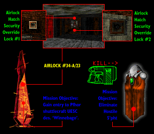 In your case, I certainly hope so. The Pfhor are now in total control of the Imbroglio. In a moment, a shuttle craft piloted by an enslaved S’pht compiler team will take off from a nearby launch pad, dock with the Imbroglio and proceed to disassemble Wotan’s core. I don’t want this to happen, so I intend to arrange, with your help, a last-minute substitution. I need you to break into the shuttle and terminate the S’pht. I will then beam in some of my own. The shuttle’s countdown has begun and the airlock sealed. It would take too long to override the security system so you’ll have to smash the airlock control circuitry. That means finding two switches that will open maintenance hatches to reveal the circuits. Once you’ve killed the enslaved S’pht, find the nearest terminal and I’ll get you out of here. Only if you completely empty the shuttle of assimilated S’pht will my own Compilers be able to enter. If they can’t enter, I won’t let you leave. Well, what are you standing around for? Get on with it.