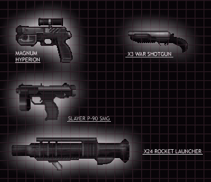 I lost contact with you earlier. No hard feelings, the commune-array simply slipped my mind. I hope you're feeling better, because now we need to find the Stak'pha. I'm assuming theyre holed-up in some religious temple, praying to Great Mother and sucking the entrails from the rodent animals native to this planet, assumedly to show their devotion. All Pfhor are masochists. Executions are regular and swift, dallying equals death, as a once-living Pfhor class Enforcer captain once stated. First thing first, i've compiled a list of the upgrades UESC has made to their already ridiculously huge list of weapons. Here is a sample of the main differences between your older weapons and the ones you've been forced to be accustomed to as of late. The Magnum Hyperion: Lighter, faster, more accurate, and makes less noise. One must wonder why the clip stays the same. X3-War shotgun: 3 cannons, for a more powerful punch. Reloading will take a bit more time, but it's power compensates for this little drawback. I knew you'd like it. The SPNKR x24: this weapon was supposed to be used on Nor'korh, but was not. Fires 3 rockets instead of two, and doesn't produce the irritating smokescreen that you were so fond of in earlier exploits. The SMG-P90 "Slayer": This SMG model uses depleted plutonium ore, which inflicts deadly trauma to the nervous systems of organic creatures. Still, it's usefulness against any other type of hostile biped is wonderous. There is more, but you're already growing bored, I can tell. Go out and use the weapons, then. Seth
