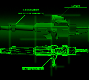 //WEAPON DIAGNOSTICS// //CLASS:OMEGA// //VERSION:1b.4// //NOTES: CAPABLE OF HARNESSING THE POWER OF A NUCLEAR REACTOR CORE PLACED IN AS AMMUNITION. ONE FULLY ACTIVE CORE CAN PRODUCE A TOTAL OF FOUR SHOTS BEFORE SATURATION OF REACTIVE WASTE REACHES CRITICAL LEVELS. THIS CANNON WILL EXPEL A SIX INCH-WIDE BALL OF ENERGY WITH THE CONCUSSIVE FORCE OF A MOVING FREIGHT TRANSPORT.
