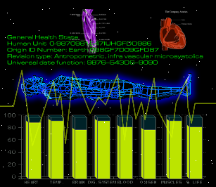 General Physiological Status: Heart functions: 97% (Paragravimetric Sownell test >98765785 lts.) Body Temperature: 94% (Dynamic Rec Range +3) Brain functionality: 99% (Gauss curve dispersion-alpha waves type G7) Digestive system work: 78% (Metaproteins gamma value Kz 20) Blood state: 100% (Paraenzymatic T-transmissors #987) Oxygen delivery: 95% (Hydrolized typical -654 abs.) Muscle structure capacity: 100% (Low frequency impulses at eps#26) Average resultant health: 98% (Universal health org. value ++0987) RECOMMENDATION: Keep activity minimal until recovery is complete.