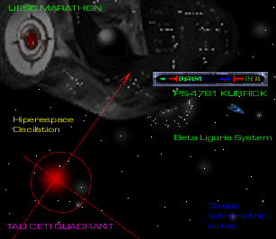 Welcome back. One hundred eighty-one hours have passed since your successful incursion into the Marathon. As you may have noticed, our location has changed: I have started a dynamic orbit around the ship, which will give us a better insertion point when you are teleported into the Marathon. Yes. You're going back. Due to limitations of the translation memory banks in the Kubrick, the Pfhor data has been only partially decoded: where this Pfhor group came from is still a mystery. However, the AyeMakSicur files were easily accessed: when capturing that ship, the Pfhor gained access to a highly confidential cargo destined for the Department of Bio-Engineering Research in the Alpha Thaesus Conglomerate.