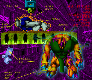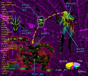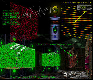 Guess what? things are getting worse. Those little devices you ran into are the Programmable Detection Mines (PDMs). It's a civil self-defense device, lifted from the AyeMakSicur and reprogrammed to react to human DNA. The PDMs seem to be taking care of abandoned zones and alerting surrounding guards. The Pfhor seem to be responding to their Hive instinct in this new habitat. I have detected high Pfhor activity in a large room nearby. But that´s not all. There are also radiation levels which correspond to the AyeMakSicur imprint. I can read several DNA codes, some of which seem to be human but "merged" with others that have been modified. Beyond recognition. Way beyond recognition. Be careful. I need you to complete your mission. Do not linger and do not, for your sanity's sake, ponder these 'beings'.