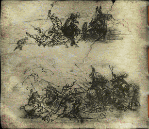 ...I had a dream last night (this is beginning to be a regular, and mildly disturbing occurrence) that seemed to come from the shadowy visitor. This time, though, the shadow explained nothing. He stood on the ramparts of this place, looking out, over the fields below, as one looking out over vast pain and suffering, like a battlefield, like Sodom, Gommorah, Babel, Jericho, or some other battle not yet fought. None of the cold bloodless fighting the city-states would have, but something even colder and emptier, more fraught with meaningless atrocities...and here my waterworks grew horrible also, and flooded everything I could see, as though my works were turned to purposeless destruction. I do not know what this vision means.