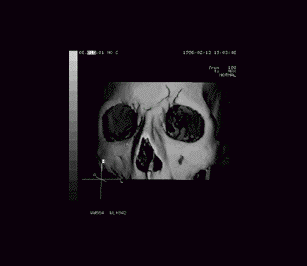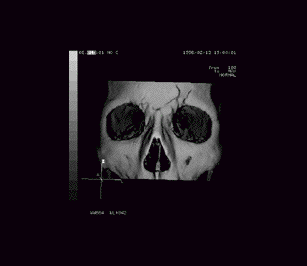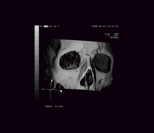 Phrenologicial Analysis IX, from fragment "Mj.l.nir". This skull shows a violent and unpredictable nature. It is no surprise that these images were found fused into the drive core of the infamous derelict colony ship Levant Newland; the raging battles for control of that vessel must have been like the womb's waters to an individual so bent on mayhem and destruction. (The forensic evidence is inconclusive; we may never know whether this individual was battling to save the crew and passengers or was actually following the directives of the ship's thinker and participating in the mass slaughter.) Phrenology: 0b0ax00xx