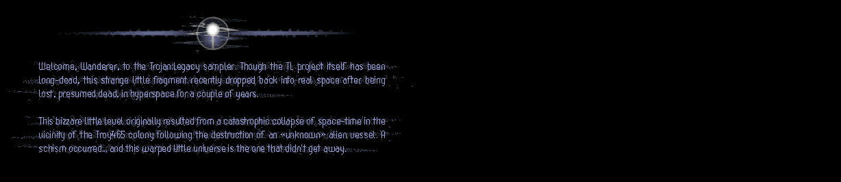 And at last, it's the end of the road for the TL sampler. And, finally, for TL too. It was an ambitious project (not many levels, but very, very dense and complex design) that struggled to come together with Mike Trinder and I taking our best shot at it despite both having only limited time available. In the end, though, we agreed to kill it after being asked to work on a project called "Wheels!" instead. I don't regret this, incidentally, as "Wheels!" was a great project and now a most excellent game (a 1st-person 'wheelchair-training' game designed specially for disabled kids) and I'm told it has proved most popular with its target audience. I'm pleased by that. Other, better projects (for me) have come and gone since TL, with varying degrees of success (and failure). I no longer have the free time to indulge on these ventures, alas, though I still enjoy doing bits and pieces around the place. TL begins to look pretty rough nowadays, certainly when compared against more recent Marathon-based projects (both mine and others'); it betrays its pre-Fux roots somewhat (athough I did add a couple of cosmetic tweaks to make this release function a little smoother), and the quality of the artwork and mapmaking is also looking somehwat 'dated'. Ah well... it was a great learning exercise in its time (it was the experience I got from working on TL that got me started on "Wheels!"). Some mention should also go to Chris Ashton, Nicholas Graham and Tom Worth for additional contributions towards TL (though not included in this sampler release). I hope there was enough good ideas in this little package to have made it worth the download. Heh, maybe it'll even be a little inspirational for someone; who knows?:) Signing off on TL (at last; maybe now I can get some hard disk space back now:)... HAS 4/7/99 p.s. The exit to this level is via the teleporter to the right of this terminal. Last one out please turn off the lights. ;)