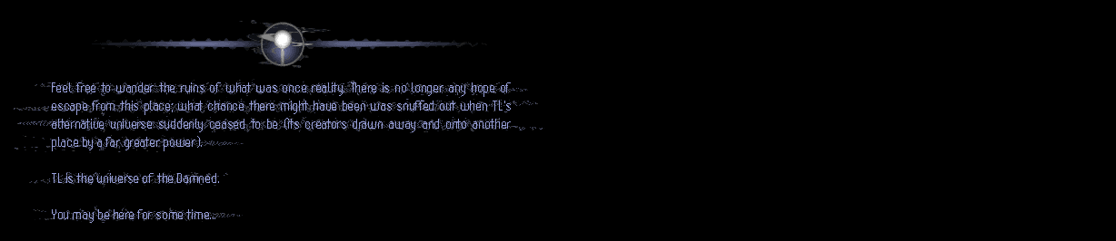 [We now return you to our traditional terminal system for space-saving reasons. Kudos to Mike Trinder for Cinemascope - the finest answer to a Mara-typographer's prayers out there.] Seeing as how the TL sampler is based on a deeply, deeply incomplete map, it seems only fair to provide a modicum of assistance to you, the traveller, as regard navigating through this place. The doors directly adjacent to this message terminal will lead you to the final section of this level. To open them, you will need to retrieve a red keycard from the security station. The station itself is locked; you will need the blue keycard to open it first. The location of the blue keycard is known; the Security Officer for this level was still carrying it when he went insane and hanged himself in a locker. The current whereabouts of the locker are much less clear, however, though you'll see what I mean soon enough. The far doorway leads to the control centre for the forward port docking bay. There is a terminal there that should explain what you'll find there a little further...